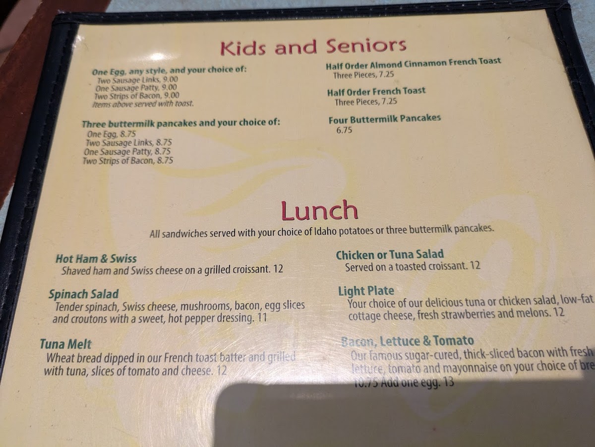 - Lunch Offerings: For lunch enthusiasts, try the Chicken Salad Croissant or the Hot Ham & Swiss, served with your choice of Idaho potatoes or indulgent buttermilk pancakes.