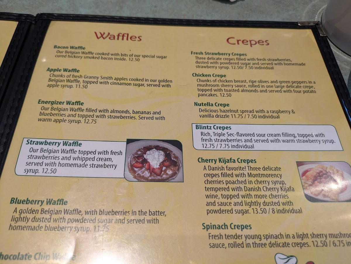 Rich Triple-sec flavored sour cream filling, topped with fresh strawberries & served with homemade strawberry syrup.