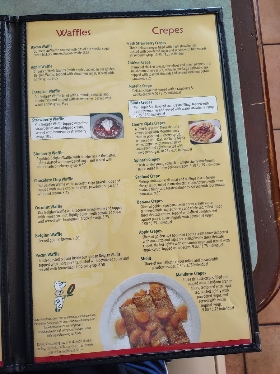 Slices of golden ripe apples in a sour cream sauce tempered with amaretto & triple-sec, rolled inside three delicate crepes. Topped with pecans, dusted lightly with cinnamon sugar & served with homemade apple syrup.